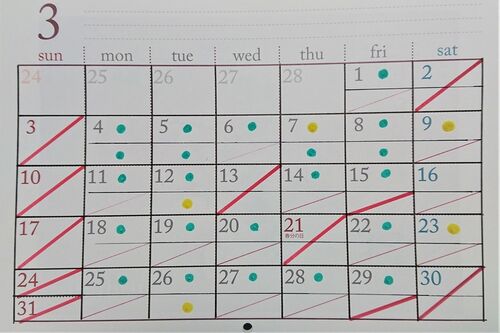 緑・・・・パターンレッスン 黄・・・・フリーレッスン 赤・・・・お休み又は活動中 無印・・・活動中 午前レッスン 10:00 ~ 12:30 午後レッスン 14:00 ~ 16:30 ★パターンレッスンは定員に達しましたので、ただ今募集はしておりません。